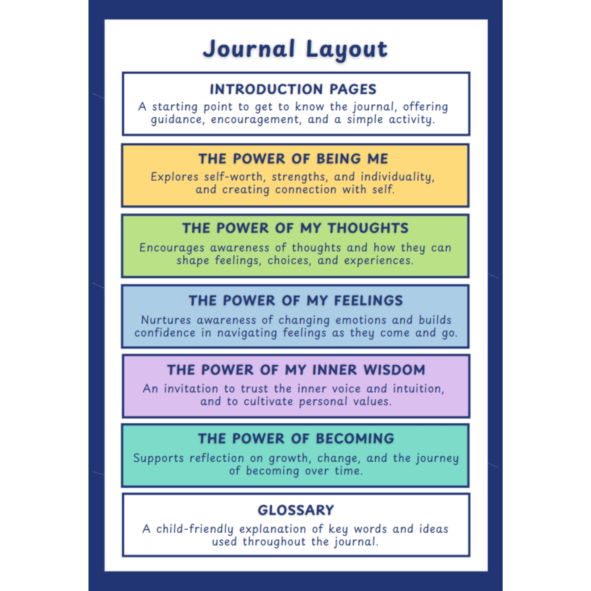 - Structured page layout to guide reflection and exploration